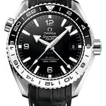 43.5 mm stainless steel case with helium escape valve, transparent back, screw-in crown, bi-directional rotating bezel with polished bi-ceramic black and white insert, domed scratch-resistant sapphire crystal with anti-reflective treatment on both sides, black ceramic dial with Arabic numerals, caliber 8906 Self-winding chronometer movement with Co-Axial escapement and GMT time zone function, approximately 60 hours of power reserve, black leather strap with rubber lining. Water resistant to 600 m (2000 ft).