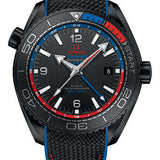 45.5 mm black ceramic case with helium escape valve, unidirectional rotating bezel with an OMEGA LiquidMetal™ diving scale that uses blue and red rubber - the colours of the New Zealand flag - for the first 10 minutes, domed scratch-resistant sapphire crystal anti-reflective treatment on both sides, vertically-brushed black ceramic dial sports 18K white gold indexes and a GMT ring with day/night display, Caliber Omega 8906 self winding movement with co-axial escapement, 24 hours gmt, chronometer, date, regatta timing, approximately 60 hours of power reserve, black structured rubber strap. Water resistant to 60 bar (600 metres / 2000 feet).