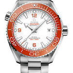 43.5 mm steel case with anti-magnetic protection and helium escape valve, transparent back, orange ceramic unidirectional bezel with diving scale filled with liquid ceramic and Super-LumiNova, domed scratch-resistant sapphire crystal with anti-reflective treatment on both sides, white ceramic dial with applied Arabic numerals in orange with date at 3 oclock, Calibre Omega 8900 self-winding co-axial master chronometer movement with date, approximately 60 hours of power reserve, steel bracelet. Water resistant to 600 metres (2000 feet).