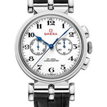 38 mm white gold case, brushed crown, scratch-resistant sapphire crystal with anti-reflective treatment inside, lacquered white dial scratch-resistant sapphire crystal with anti-reflective treatment inside, Calibre Omega 3203 manual-winding chronometer movement with chronograph and small seconds, black leather strap. Water resistant to 30 metres (100 feet).