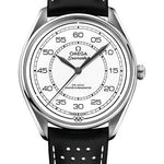 39.5 mm steel case with anti-magnetic protection, transparent back, domed scratch-resistant sapphire crystal with anti-reflective treatment on both sides, white domed dial of each watch, Calibre Omega 8806 self-winding chronometer movement, approximately 55 hours of power reserve, black micro-perforated leather strap. Water resistant to 60 metres (200 feet).