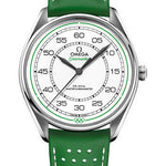 39.5 mm steel case with anti-magnetic protection, transparent back, domed scratch-resistant sapphire crystal with anti-reflective treatment on both sides, white domed dial of each watch, Calibre Omega 8806 self-winding chronometer movement, approximately 55 hours of power reserve, green micro-perforated leather strap. Water resistant to 60 metres (200 feet).