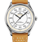 39.5 mm steel case with anti-magnetic protection, transparent back, domed scratch-resistant sapphire crystal with anti-reflective treatment on both sides, white domed dial of each watch, Calibre Omega 8806 self-winding chronometer movement, approximately 55 hours of power reserve, yellow micro-perforated leather strap. Water resistant to 60 metres (200 feet).