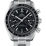 44.25 mm stainless steel case with antimagnetic design, transparent back, black ceramic bezel with tachymeter scale in liquidmetal, domed scratch-resistant sapphire crystal with anti-reflective treatment on both sides, black dial with racing style minute-track, caliber 9900 self-winding Co-Axial master chronometer movement with chronograph and date functions, approximately 60 hours of power reserve, stainless steel bracelet. Water resistant to 50 m (167 ft).