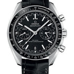 44.25 mm stainless steel case with antimagnetic design, transparent back, black ceramic bezel with tachymeter scale in liquidmetal, domed scratch-resistant sapphire crystal with anti-reflective treatment on both sides, black dial with racing style minute-track, caliber 9900 self-winding Co-Axial master chronometer movement with chronograph and date functions, approximately 60 hours of power reserve, black leather strap. Water resistant to 50 m (167 ft).