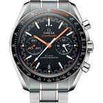 44.25 mm stainless steel case with antimagnetic design, transparent back, black ceramic bezel with tachymeter scale in orange wording and liquidmetal scale, domed scratch-resistant sapphire crystal with anti-reflective treatment on both sides, matt black dial with racing style minute-track, caliber 9900 self-winding Co-Axial master chronometer movement with chronograph and date functions, approximately 60 hours of power reserve, stainless steel bracelet. Water resistant to 50 m (167 ft).