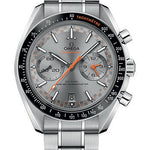 44.25 mm stainless steel case with antimagnetic design, transparent back, black ceramic bezel with tachymeter scale in orange wording and liquidmetal scale, domed scratch-resistant sapphire crystal with anti-reflective treatment on both sides, sun brushed grey dial with racing style minute-track, caliber 9900 self-winding Co-Axial master chronometer movement with chronograph and date functions, approximately 60 hours of power reserve, stainless steel bracelet. Water resistant to 50 m (167 ft).