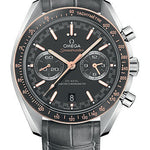 44.25 mm stainless steel case with antimagnetic design, transparent back, 18K Sedna gold bezel with silicon nitride ring and tachymeter scale in Ceragold, domed scratch-resistant sapphire crystal with anti-reflective treatment on both sides, matt grey dial with racing style minute-track, caliber 9900 self-winding Co-Axial master chronometer movement with chronograph and date functions, approximately 60 hours of power reserve, grey leather strap. Water resistant to 50 m (167 ft).