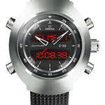 43 x 53 mm titanium case Pilot Line shape, scratch-resistant sapphire crystal with anti-reflective treatment on both sides, black dial, thermo-compensated multi-functional quartz Omega 5666 movement with dedicated pilot functions, analog hands, LCD windows display, time, UTC, chronograph, alarm, perpetual calendar, function menu, approximately 24 months of power reserve, black rubber strap. Water resistant to 30 m.