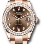 31mm 18K Everose gold case, screw-down crown with twinlock double waterproofness system, bezel set with 46 diamonds, scratch-resistant sapphire crystal with cyclops lens over the date, chocolate dial, diamond hour markers, Rolex calibre 2236 automatic movement with center hour, minute and seconds hands, instantaneous date with rapid setting, and stop-seconds for precise time setting, approximately 55 hours of power reserve, 18K Everose gold Oyster bracelet with flat three-piece links, concealed folding Crownclasp buckle. Waterproof to 100 meters. Baselworld 2019 release.