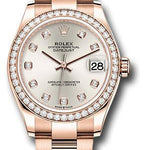 31mm 18K Everose gold case, screw-down crown with twinlock double waterproofness system, bezel set with 46 diamonds, scratch-resistant sapphire crystal with cyclops lens over the date, silver dial, diamond hour markers, Rolex calibre 2236 automatic movement with center hour, minute and seconds hands, instantaneous date with rapid setting, and stop-seconds for precise time setting, approximately 55 hours of power reserve, 18K Everose gold Oyster bracelet with flat three-piece links, concealed folding Crownclasp buckle. Waterproof to 100 meters. Baselworld 2019 release.