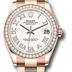 31mm 18K Everose gold case, screw-down crown with twinlock double waterproofness system, bezel set with 46 diamonds, scratch-resistant sapphire crystal with cyclops lens over the date, white dial, Roman numerals, Rolex calibre 2236 automatic movement with center hour, minute and seconds hands, instantaneous date with rapid setting, and stop-seconds for precise time setting, approximately 55 hours of power reserve, 18K Everose gold Oyster bracelet with flat three-piece links, concealed folding Crownclasp buckle. Waterproof to 100 meters. Baselworld 2019 release.
