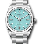 36mm Oystersteel case, screw-down crown with twinlock double waterproofness system, domed bezel, scratch-resistant sapphire crystal, turquoise bright blue dial, index hour markers, Rolex calibre 3230 automatic movement with center hour, minute and seconds hands, and stop-seconds for precise time setting, approximately 70 hours of power reserve, Oyster bracelet with flat three-piece links, folding Oysterclasp buckle with Easylink 5mm comfort extension link. Waterproof to 100 meters.