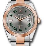 41mm Everose Rolesor case with 904L steel monobloc middle case, screw-down steel back, 18K Everose gold screw-down crown, 18K Everose gold smooth bezel, scratch-resistant double anti-reflective sapphire crystal with cyclops lens over the date, slate gray dial, green Roman numerals, Rolex calibre 3235 perpetual self-winding movement with date at 3 o'clock that changes instantaneously at midnight in a few thousandths of a second, approximately 70 hours of power reserve, Everose Rolesor Oyster bracelet made from a combination of 904L steel and 18K Everose gold with flat three-piece links, folding Oysterclasp buckle with Easylink 5mm comfort extension link. Waterproof to 100 meters.
