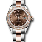 28mm Everose Rolesor case comprised of a 904L steel monobloc middle case, screw-down steel back, 18K Everose gold screw-down crown with twinlock double waterproofness system, 18K Everose gold diamond bezel, scratch-resistant sapphire crystal with cyclops lens over the date and double anti-reflective coating, chocolate dial, Roman numerals, Rolex calibre 2236 automatic movement with center hour, minute and seconds hands, instantaneous date with rapid setting, and stop-seconds for precise time setting, Everose Rolesor Oyster bracelet comprised of a combination of 904L steel and 18K Everose gold in flat three-piece links, folding Oysterclasp buckle with Easylink 5mm comfort extension link. Waterproof to 100 meters.