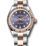 28mm Everose Rolesor case comprised of a 904L steel monobloc middle case, screw-down steel back, 18K Everose gold screw-down crown with twinlock double waterproofness system, 18K Everose gold fluted bezel, scratch-resistant sapphire crystal with cyclops lens over the date and double anti-reflective coating, aubergine dial, diamond hour markers, Rolex calibre 2236 automatic movement with center hour, minute and seconds hands, instantaneous date with rapid setting, and stop-seconds for precise time setting, Everose Rolesor Oyster bracelet comprised of a combination of 904L steel and 18K Everose gold in flat three-piece links, folding Oysterclasp buckle with Easylink 5mm comfort extension link. Waterproof to 100 meters.