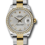 31mm stainless steel case, yellow gold gold screw-down crown, 18K yellow gold bezel set with 46 diamonds, scratch-resistant sapphire crystal with cyclops lens over the date, silver dial, diamond hour markers, Rolex calibre 2235 automatic movement, stainless steel and yellow gold Oyster bracelet with flat three-piece links, folding Oysterclasp buckle with Easylink 5mm comfort extension link. Waterproof to 100 meters.