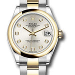 31mm yellow Rolesor case comprised of Oystersteel and 18K yellow gold, screw-down back, screw-down crown with twinlock double waterproofness system, 18K yellow gold domed bezel, scratch-resistant sapphire crystal with cyclops lens over the date, silver dial, diamond hour markers, Rolex calibre 2236 perpetual self-winding movement with date at 3 o'clock, approximately 55 hours of power reserve, yellow Rolesor Oyster bracelet made from a combination of 904L steel and 18K yellow gold with flat three-piece links, folding Oysterclasp buckle with Easylink 5mm comfort extension link. Waterproof to 100 meters. Baselworld 2019 release.