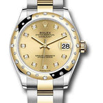 31mm yellow Rolesor case comprised of Oystersteel and 18K yellow gold, screw-down back, screw-down crown with twinlock double waterproofness system, 18K yellow gold domed bezel set with diamonds, scratch-resistant sapphire crystal with cyclops lens over the date, champagne dial, diamond hour markers, Rolex calibre 2236 perpetual self-winding movement with date at 3 o'clock, approximately 55 hours of power reserve, yellow Rolesor Oyster bracelet made from a combination of 904L steel and 18K yellow gold with flat three-piece links, folding Oysterclasp buckle with Easylink 5mm comfort extension link. Waterproof to 100 meters. Baselworld 2019 release.