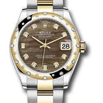 31mm yellow Rolesor case comprised of Oystersteel and 18K yellow gold, screw-down back, screw-down crown with twinlock double waterproofness system, 18K yellow gold domed bezel set with diamonds, scratch-resistant sapphire crystal with cyclops lens over the date, dark mother-of-pearl dial, diamond hour markers, Rolex calibre 2236 perpetual self-winding movement with date at 3 o'clock, approximately 55 hours of power reserve, yellow Rolesor Oyster bracelet made from a combination of 904L steel and 18K yellow gold with flat three-piece links, folding Oysterclasp buckle with Easylink 5mm comfort extension link. Waterproof to 100 meters. Baselworld 2019 release.