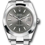41mm 904L stainless steel case, screw-down steel back, screw-down crown with twinlock double waterproofness system, smooth bezel, scratch-resistant double anti-reflective sapphire crystal with cyclops lens over the date, dark rhodium dial, index hour markers, Rolex calibre 3235 perpetual self-winding movement with date at 3 o'clock that changes instantaneously at midnight in a few thousandths of a second, approximately 70 hours of power reserve, 904L steel Oyster bracelet with flat three-piece links, folding Oysterclasp buckle with Easylink 5mm comfort extension link. Waterproof to 100 meters.