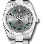 41mm 904L stainless steel case, screw-down steel back, screw-down crown with twinlock double waterproofness system, smooth bezel, scratch-resistant double anti-reflective sapphire crystal with cyclops lens over the date, slate dial, green Roman numerals, Rolex calibre 3235 perpetual self-winding movement with date at 3 o'clock that changes instantaneously at midnight in a few thousandths of a second, approximately 70 hours of power reserve, 904L steel Oyster bracelet with flat three-piece links, folding Oysterclasp buckle with Easylink 5mm comfort extension link. Waterproof to 100 meters.