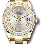 31mm 18K yellow gold case, screw-down crown with twinlock double waterproofness system, bezel set with 46 diamonds, scratch-resistant sapphire crystal with cyclops lens over the date, silver diamond Roman IV dial, Roman numerals with 11 diamonds set on VI, Rolex calibre 2236 automatic movement with center hour, minute and seconds hands, instantaneous date with rapid setting, and stop-seconds for precise time setting, approximately 55 hours of power reserve, 18K yellow gold Oyster bracelet with flat three-piece links, concealed folding Crownclasp buckle. Waterproof to 100 meters.