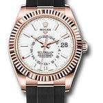 42mm 18K Everose gold case, screw-down back, screw-down crown with twinlock double waterproofness system, fluted bezel, scratch-resistant sapphire crystal with cyclops lens over the date, white dial, index hour markers, Rolex calibre 9001 automatic movement with 24-hour display on off-centre disc, second time zone, instantaneous annual calendar at 3 o'clock and rapid-setting of the date, month display via 12 apertures around the circumference of the dial, stop-seconds for precise time setting, approximately 72 hours of power reserve, Oysterflex bracelet made from flexible metal blades overmoulded with high-performance elastomer, folding Oysterclasp buckle with glidelock extension system. Waterproof to 100 meters.