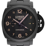44mm black ceramic case, see-through sapphire crystal back, black ceramic bezel, black ceramic device protecting the crown, black dial with luminous Arabic numerals and hour markers, date at 3 o’clock, seconds at 9 o’clock, automatic Panerai P.9001/B calibre movement with hours, minutes, small seconds, date, approximately 3 days of power reserve ceramic bracelet. Water resistant to 100 meters.
