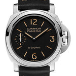 44mm AISI 316L polished steel case, sapphire crystal back, polished steel bezel, black dial with luminous arabic numerals and hour markers, small seconds at 9 o'clock, P.5000 calibre handwound movement with hours, minutes, small seconds, approximately 8 days of power reserve, black calf ponte vecchio strap with beige stitching. Water resistant to 30 bar (~300 metres).