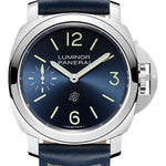 44mm AISI 316L polished steel case, brushed steel back, blue sun-brushed dial with luminous Arabic numerals and hour markers, small seconds at 9 o'clock, P.6000 calibre hand-wound movement with hours, minutes, small seconds, approximately 3 days of power reserve, dark blue calf strap with beige stitching. Water resistant to 10 bar (~100 metres).