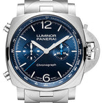 44mm AISI 316L brushed steel case, polished steel bezel, blue sun-brushed dial with luminous arabic numerals and hour markers, hollowed chronograph minutes counter at 3 o’clock and small seconds counter at 9 o’clock, central chronograph seconds hands, tachymeter scale in the external “rehaut”, P.9200 calibre automatic movement, steel bracelet. Water resistant to 10 bar (~100 metres).