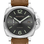 42mm AISI 316L polished steel case, polished steel bezel, sun-brushed anthracite dial with arabic numerals and hour markers, date at 3 o'clock and small seconds at 9 o'clock, P.900 calibre automatic movement with date, hours, minutes, small seconds, approximately 72 hours of power reserve, dark brown scamosciato strap with beige stitching. Water resistant to 3 bar (~30 metres).