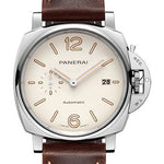 42mm AISI 316L polished steel case, polished steel bezel, white dial with luminous arabic numerals and hour markers, date at 3 o'clock and small seconds at 9 o'clock, P.900 calibre automatic movement with date, hours, minutes, small seconds, approximately 72 hours of power reserve, dark brown calf ponte vecchio strap with beige stitching. Water resistant to 3 bar (~30 metres).