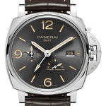 45mm AISI 316L steel case, polished steel bezel, grey dial, P.4002 calibre automatic movement with hours, minutes, small seconds, date, gmt, 24h indicator, power reserve indicator, seconds reset, approximately 3 days of power reserve, dark brown alligator strap with beige stitching. Water resistant to 3 bar (~30 metres).