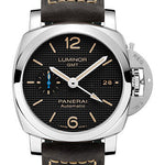 42 mm AISI 316L polished steel case, sapphire crystal back, polished steel bezel, black dial with paris hobnails, luminous arabic numerals and hour markers, date at 3 o’clock, seconds at 9 o’clock, P.9011 calibre automatic movement with hours, minutes, small seconds, date, gmt, power reserve indicator on the back, seconds reset, approximately 3 days of power reserve, black scamosciato strap with beige stitching. Water resistant to 10 bar (~100 metres).