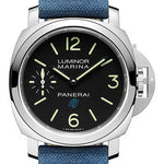 44mm AISI 316L brushed steel case, black dial with luminous arabic numerals and hour markers, small seconds at 9 o'clock, P.6000 calibre hand-wound movement with hours, minutes, approximately 3 days of power reserve, blue canvas strap with blue stitching. Water resistant to 10 bar (~100 metres).