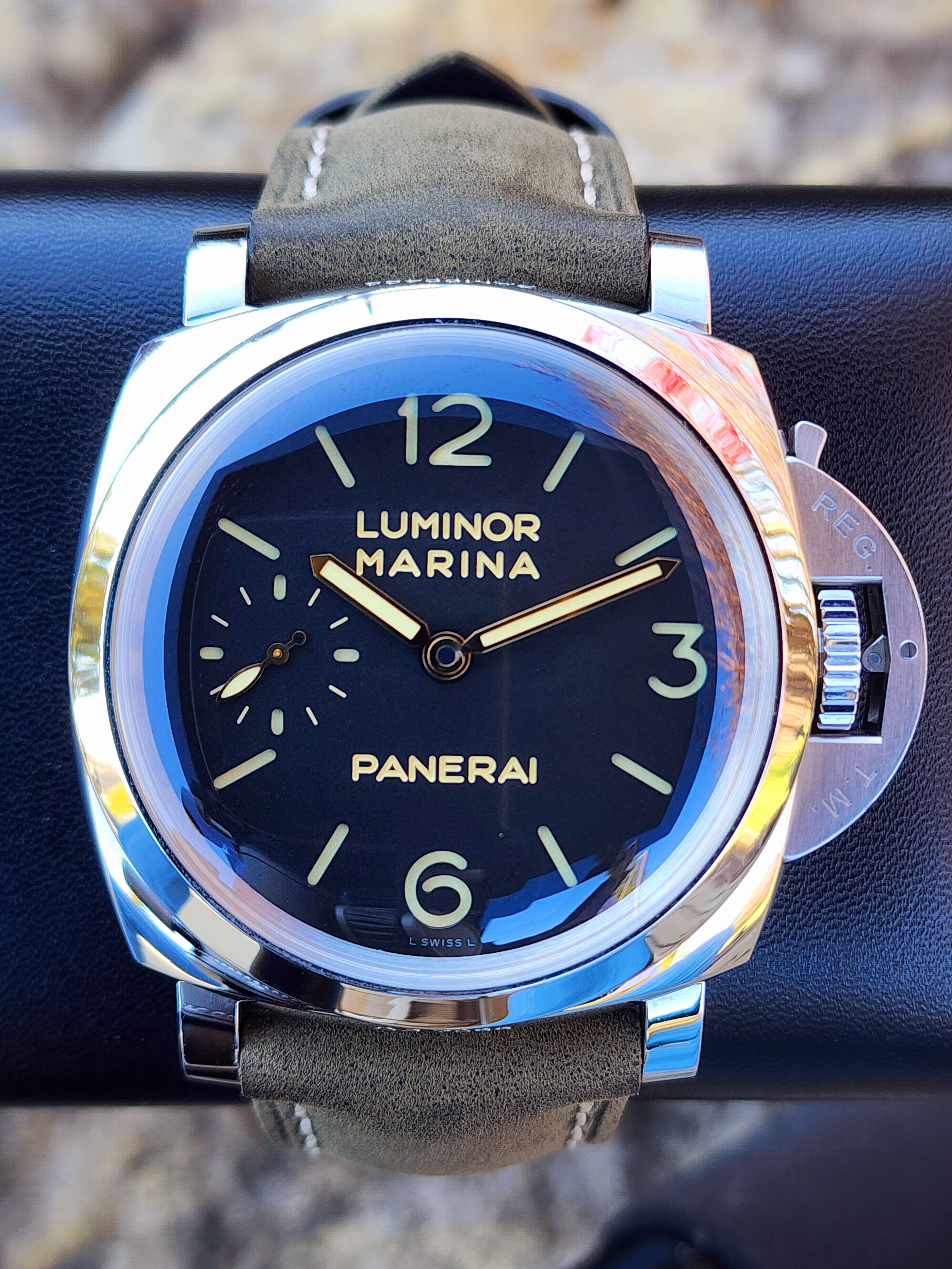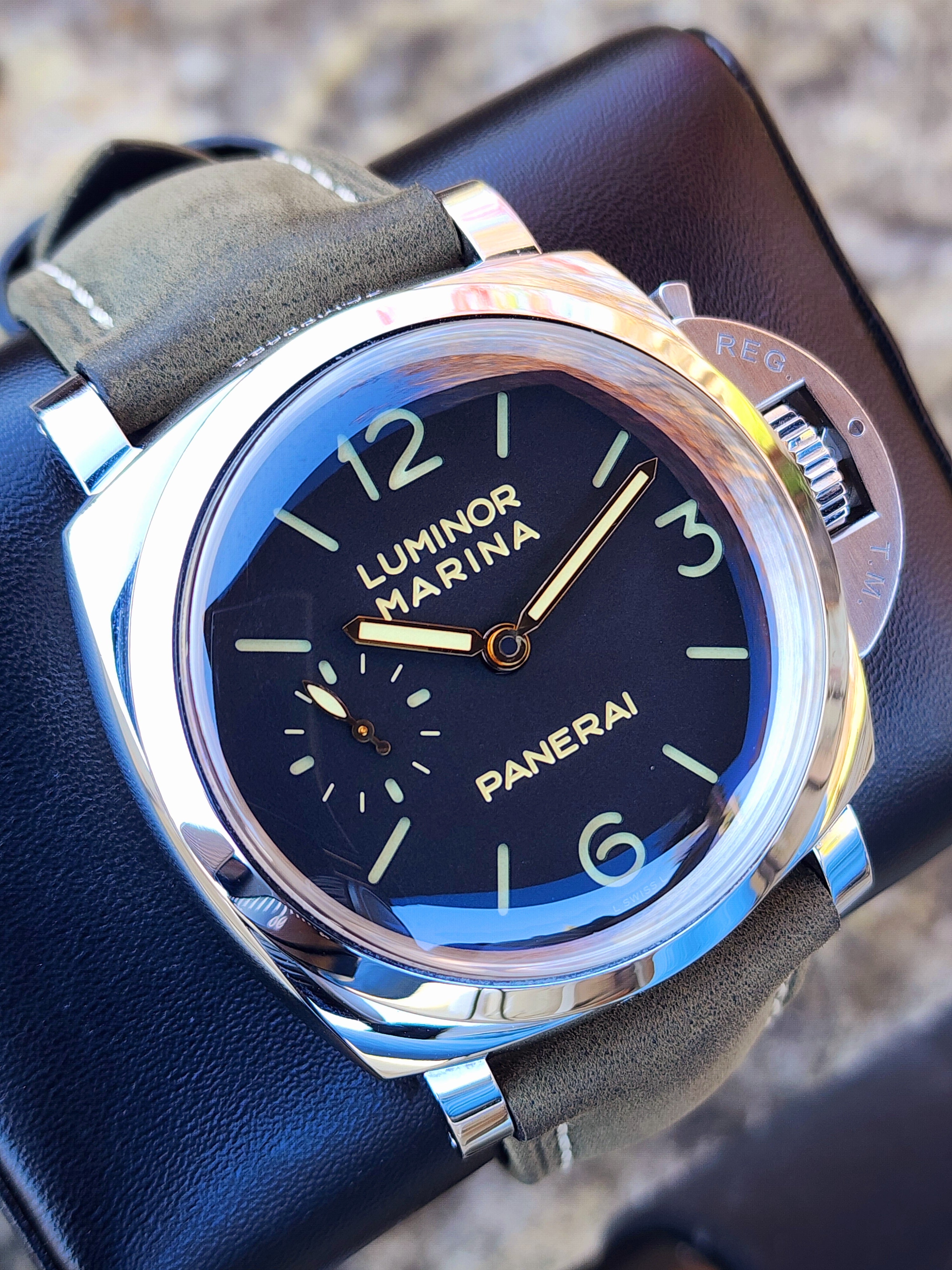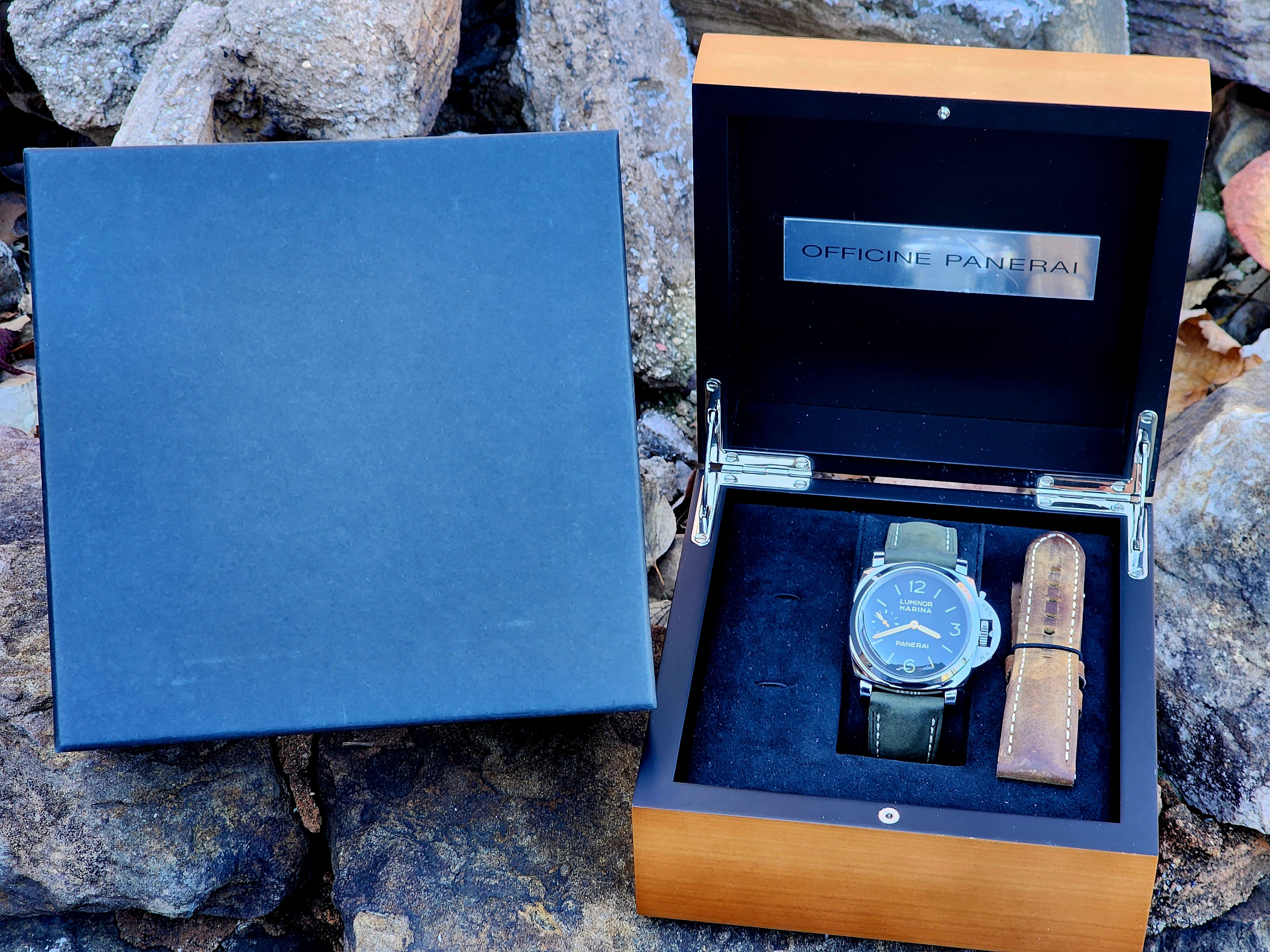 Up for sale is the Panerai Luminor Marina 1950 3 Days Black Dial 47mm PAM00422 with Panerai box. Timepiece is dated 2017. MSRP $12,000. It was recently placed on a timegrapher and is running well. Do excuse the dust/lint in the pictures as all of our watches are photographed outdoors in natural lighting/conditions. The serial numbers have been blurred for privacy. This timepiece is in very good condition with some minor wear on the bezel. Timepiece is located in Indiana.