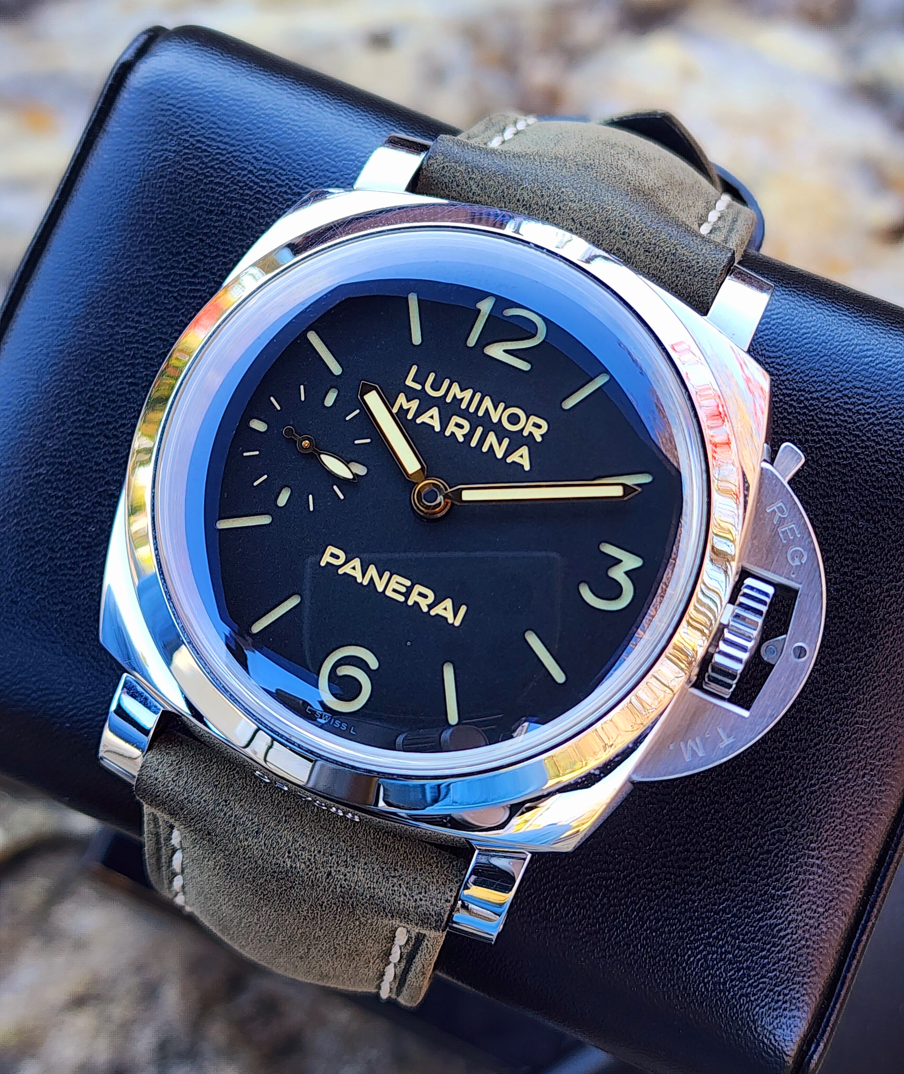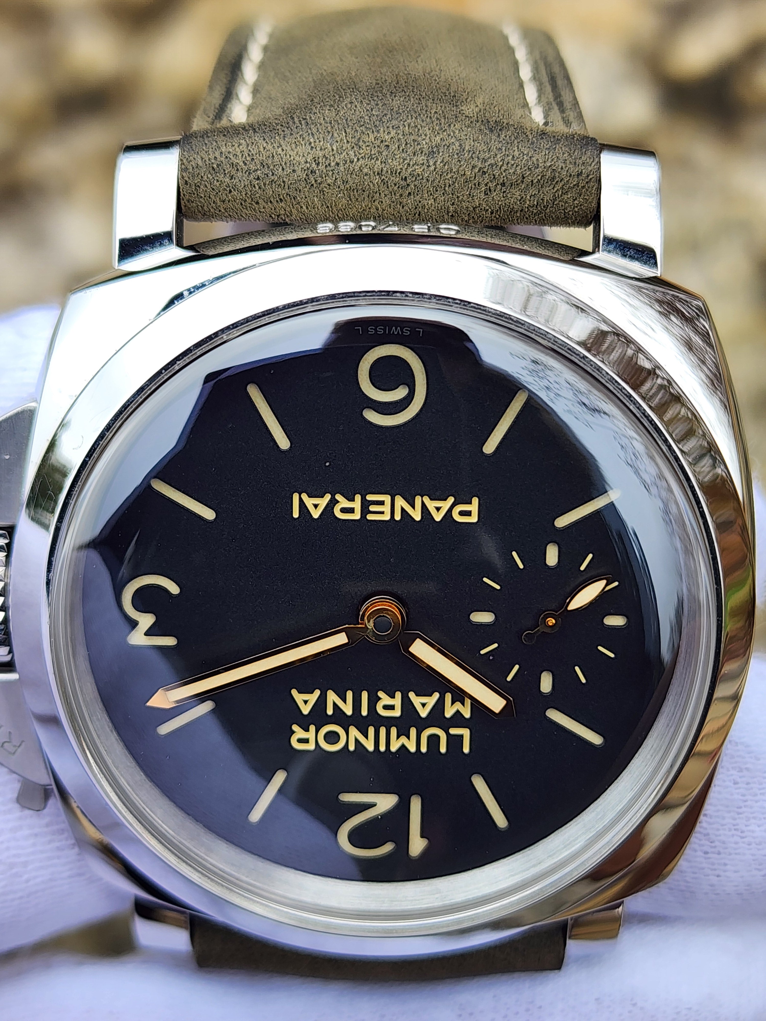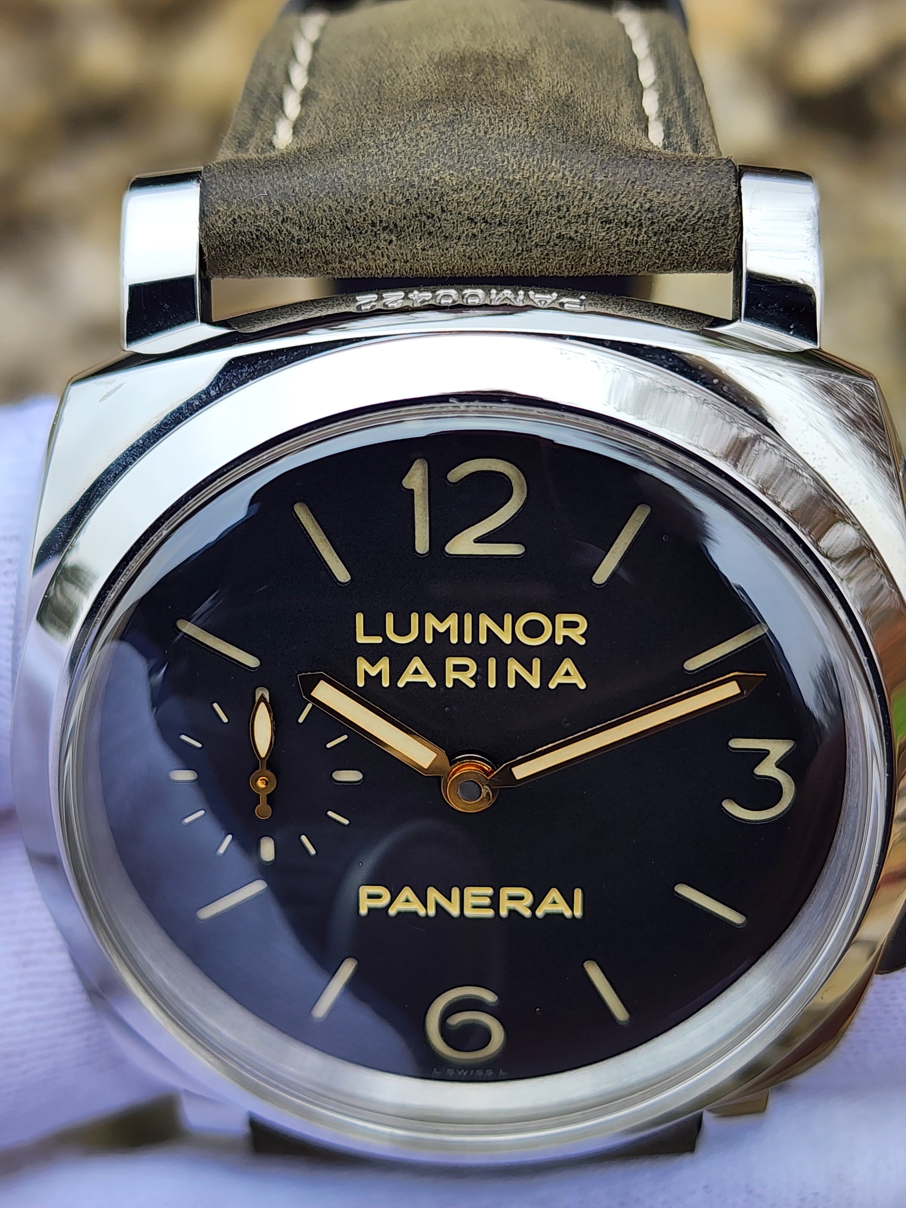 Up for sale is the Panerai Luminor Marina 1950 3 Days Black Dial 47mm PAM00422 with Panerai box. Timepiece is dated 2017. MSRP $12,000. It was recently placed on a timegrapher and is running well. Do excuse the dust/lint in the pictures as all of our watches are photographed outdoors in natural lighting/conditions. The serial numbers have been blurred for privacy. This timepiece is in very good condition with some minor wear on the bezel. Timepiece is located in Indiana.
