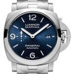 44mm AISI 316L brushed steel case, polished steel bezel, blue sun-brushed dial with luminous arabic numerals and hour markers, date at 3 o'clock and small seconds at 9 o'clock, P.9010 calibre automatic movement with hours, minutes, small seconds, date, approximately 3 days of power reserve, steel bracelet. Water resistant to 30 bar (~300 metres).