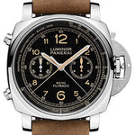 44mm AISI 316L polished steel case, polished steel bezel, black dial with luminous arabic numerals, chronograph counter at 3 o'clock, small seconds at 9 o'clock and central chronograph seconds and minute hands, P.9100 calibre automatic movement with hours, minutes, small seconds, date, chronograph flyback, seconds reset, approximately 3 days of power reserve, dark brown scamosciato strap with beige stitching. Water resistant to 10 bar (~100 metres).