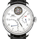 IWC Portugieser Tourbillon Mystere Retrograde Watch - 44.2 mm Platinum Case - Silver Dial - Black Alligator Strap - IW504601