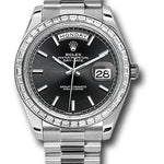 40mm 950 platinum case, screw-down back with Rolex fluting, screw-down crown with twinlock double waterproofness system, bezel set with 40 baguette-cut diamonds, scratch-resistant double anti-reflective sapphire crystal with cyclops lens over the date, black dial, index hour markers with Chromalight, Rolex calibre 3255 automatic movement with centre hour, minute and seconds hands, instantaneous day and date in apertures, unrestricted rapid-setting, and stop-seconds for precise time setting, approximately 70 hours of power reserve, President bracelet with three-piece solid links comprised of a polished center link, satin-finished outer links, and ceramic inserts, concealed folding Crownclasp buckle. Waterproof to 100 meters.