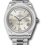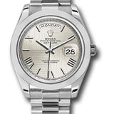 40mm 950 platinum case, screw-down back with Rolex fluting, screw-down crown with twinlock double waterproofness system, smooth bezel, scratch-resistant double anti-reflective sapphire crystal with cyclops lens over the date, silver quadrant motif dial, bevelled deconstructed Roman numerals, Rolex calibre 3255 automatic movement with centre hour, minute and seconds hands, instantaneous day and date in apertures, unrestricted rapid-setting, and stop-seconds for precise time setting, approximately 70 hours of power reserve, President bracelet with three-piece solid links comprised of a polished center link, satin-finished outer links, and ceramic inserts, concealed folding Crownclasp buckle. Waterproof to 100 meters.