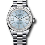 28mm platinum case, screw-down crown with twinlock double waterproofness system, domed bezel set with 44 diamonds, scratch-resistant sapphire crystal with cyclops lens over the date and double anti-reflective coating, ice blue dial, 36 diamonds set in index hour markers and 8 diamond set in Roman numeral IX, Rolex calibre 2236 automatic movement with center hour, minute and seconds hands, instantaneous date with rapid setting, and stop-seconds for precise time setting, platinum President bracelet with semi-circular three-piece links, concealed folding Crownclasp buckle. Waterproof to 100 meters.