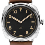 47mm AISI 316L polished steel case with removable wire loop strap attachments, see-through sapphire crystal back, screw-down crown, black dial with luminous Arabic and Roman numerals and hour markers, hand-wound Panerai P.3000 calibre movement with hours and minutes, approximately 3 days of power reserve, brown leather strap. Water resistant to 100 meters.