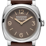 47 mm polished AISI 316 stainless steel case, see-through sapphire crystal back, brown dial with luminous Arabic numerals and hour markers, P.3000 calibre hand-wound movement with hours and minutes, approximately 3 days of power reserve, dark brown Ponte Vecchio calf strap with beige stitching. Water resistant to 10 bar.