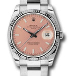 34mm polished stainless steel case, 18K white gold fluted bezel, pink dial, index hour markers, and Oyster bracelet with brushed outer links and polished center links.