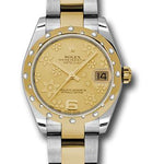 31mm stainless steel case, 18K yellow gold domed bezel set with 24 diamonds, champagne dial, floral motif, and stainless steel and 18K yellow gold Oyster bracelet.
