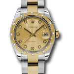 31mm stainless steel case, 18K yellow gold domed bezel set with 24 diamonds, champagne jubilee dial, diamond hour markers, and stainless steel and 18K yellow gold Oyster bracelet.